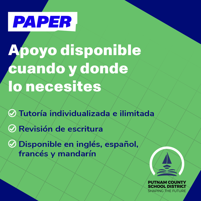 The Putnam County School District is excited to announce another resource available for our students- Paper Education Tutoring. This online academic tutoring platform is available now to students in grades 7-12 for all subject areas.