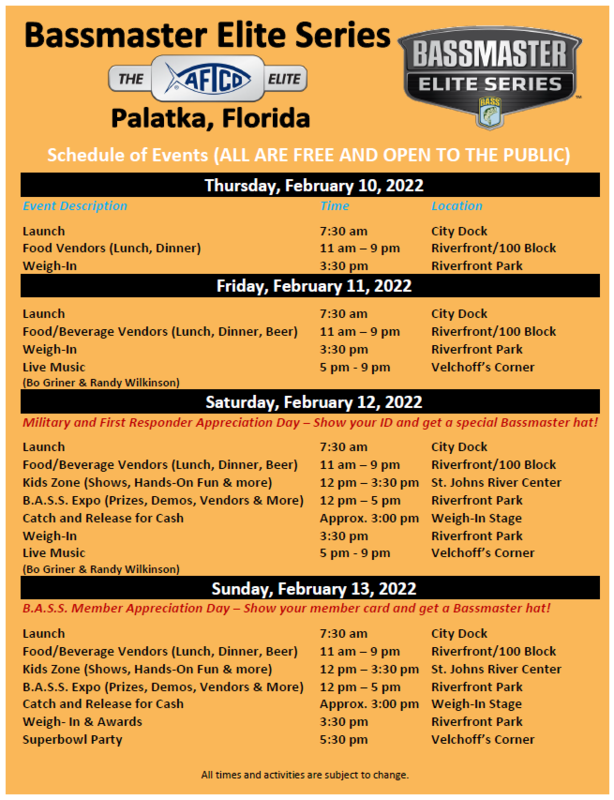 Other activities planned throughout the weekend at the AFTCO Bassmaster Elite at St. Johns River include: games and prizes for attendees, angler autographs and photo sessions and the opportunity to learn tips and techniques from some of the best bass anglers in the world.